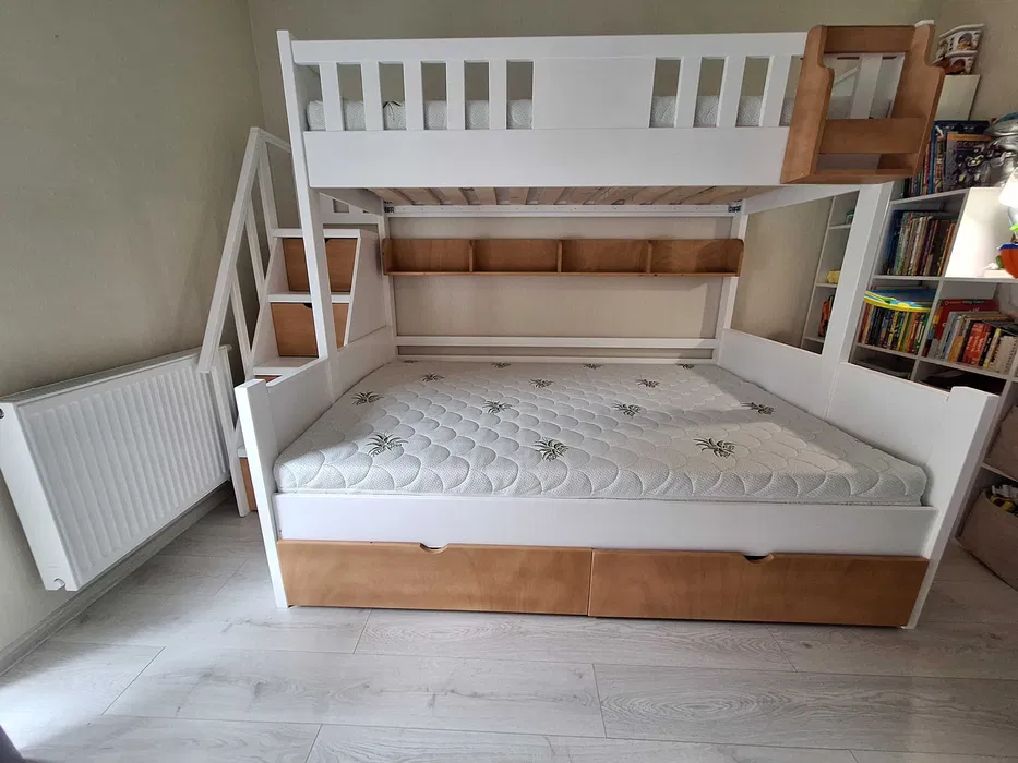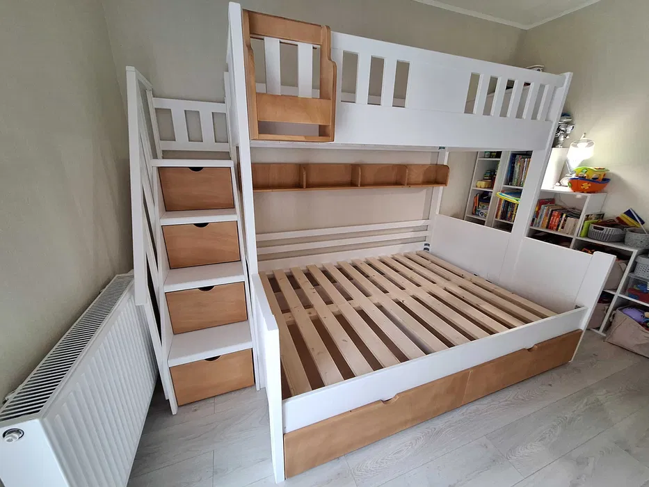 Patul etajat din lemn masiv este o solutie practica si rezistenta pentru camerele copiilor sau pentru spatiile unde este necesara utilizarea eficienta a locului. Realizat din lemn masiv de calitate, acest model este conceput pentru saltele de 200×140 cm la nivelul inferior si 200×90 cm la nivelul superior, oferind stabilitate, siguranta si confort in utilizarea zilnica.