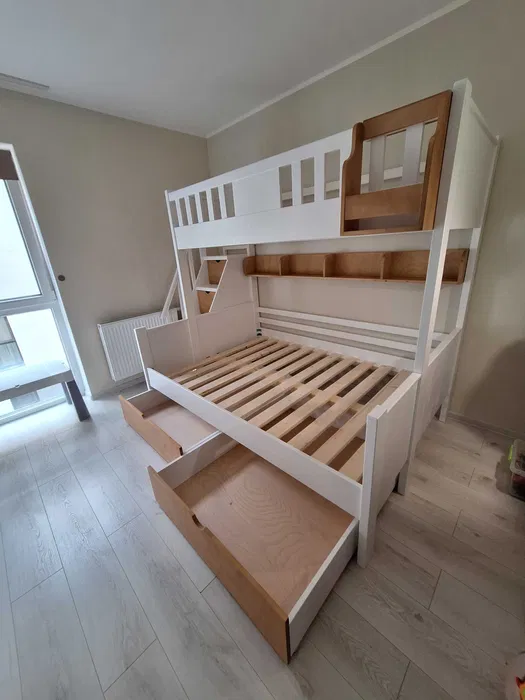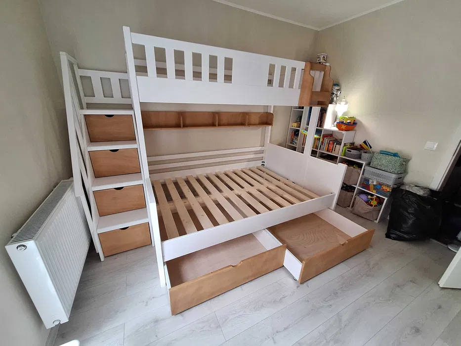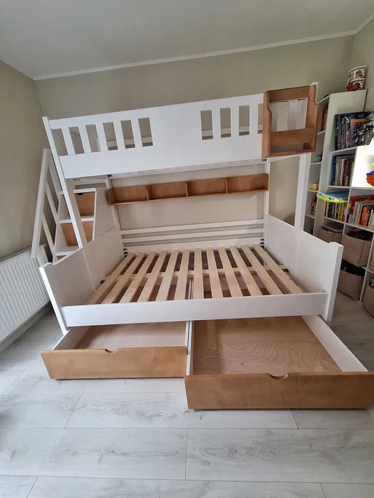 Dimensiunile sunt: 257 cm lungime, 147 cm latime si 185 cm inaltime, iar patul este complet demontabil si foarte usor de montat. In pret sunt incluse somierele, sertarele, rafturile si kitul pentru montaj, iar finisajele se realizeaza la comanda prin vopsire sau lacuire cu produse ecologice pe baza de apa, sigure pentru copii si prietenoase cu mediul.