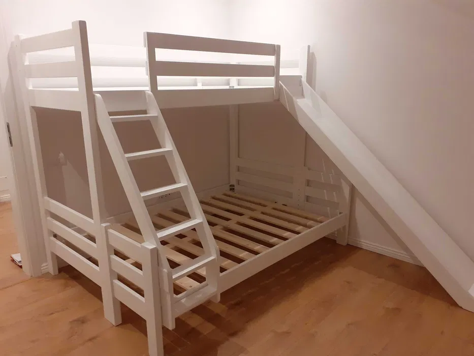 Pat supraetajat cu tobogan din lemn masiv – o soluție ideală pentru camera copiilor, oferind un spațiu de joacă și somn confortabil. La partea superioară, patul este dotat cu un platou din lemn masiv vopsit, care poate fi utilizat ca platou pentru joacă sau ca pat ocazional cu o saltea de 200/90 cm sau pneumatică. Patul este proiectat pentru saltele de 200/140 cm și 200/90 cm și este ușor de montat.